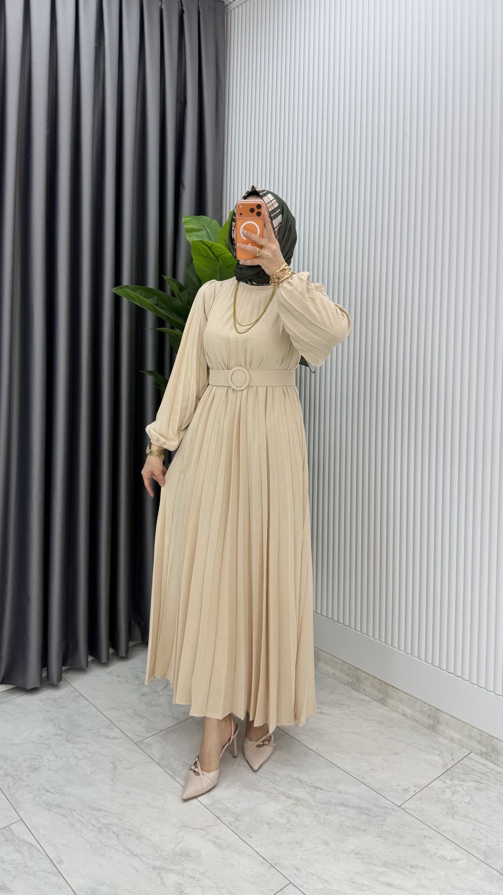Bej Hifa Piliseli Elbise Tesettür Giyim