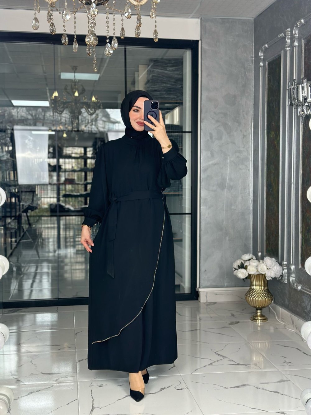 Kumaş kreptir. Hareketli, Şerit taş detaylı, Sırt Fermuarlıdır.Seyyar Kemerlidir.