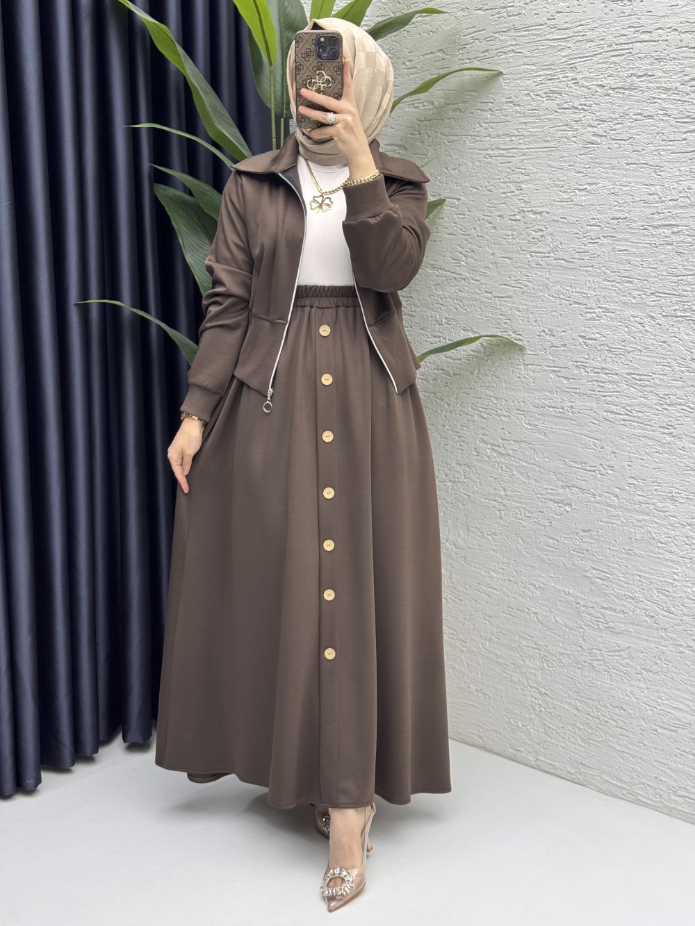 Dilruba Etekli Takım Tesettür Giyim Kahve