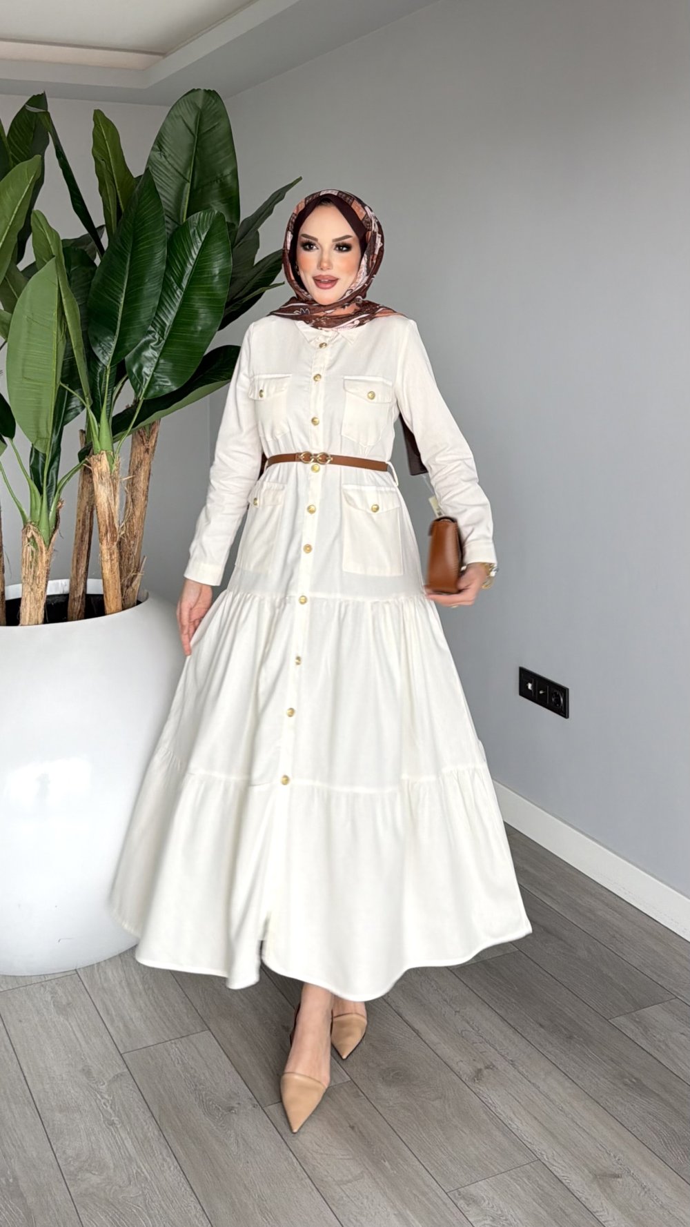 Ekru Premium Kemerli Melisa Kot Elbise Tesettür Giyim