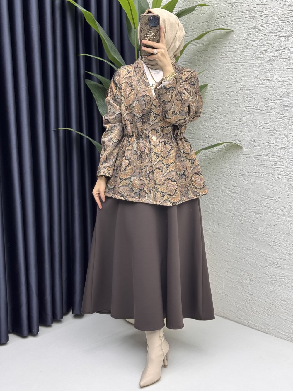 Etnik Etekli Takım Tesettür Giyim Kahve