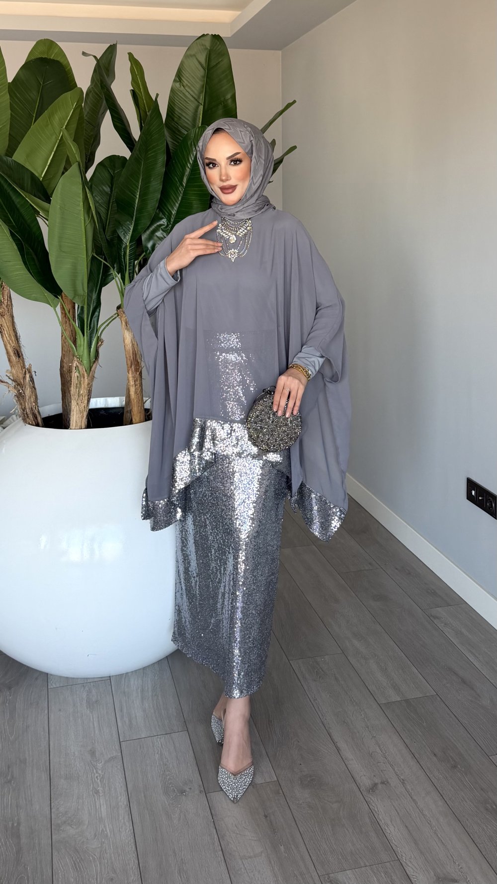 Gri Premium Fatma Payetli Etek Takım Tesettür Giyim