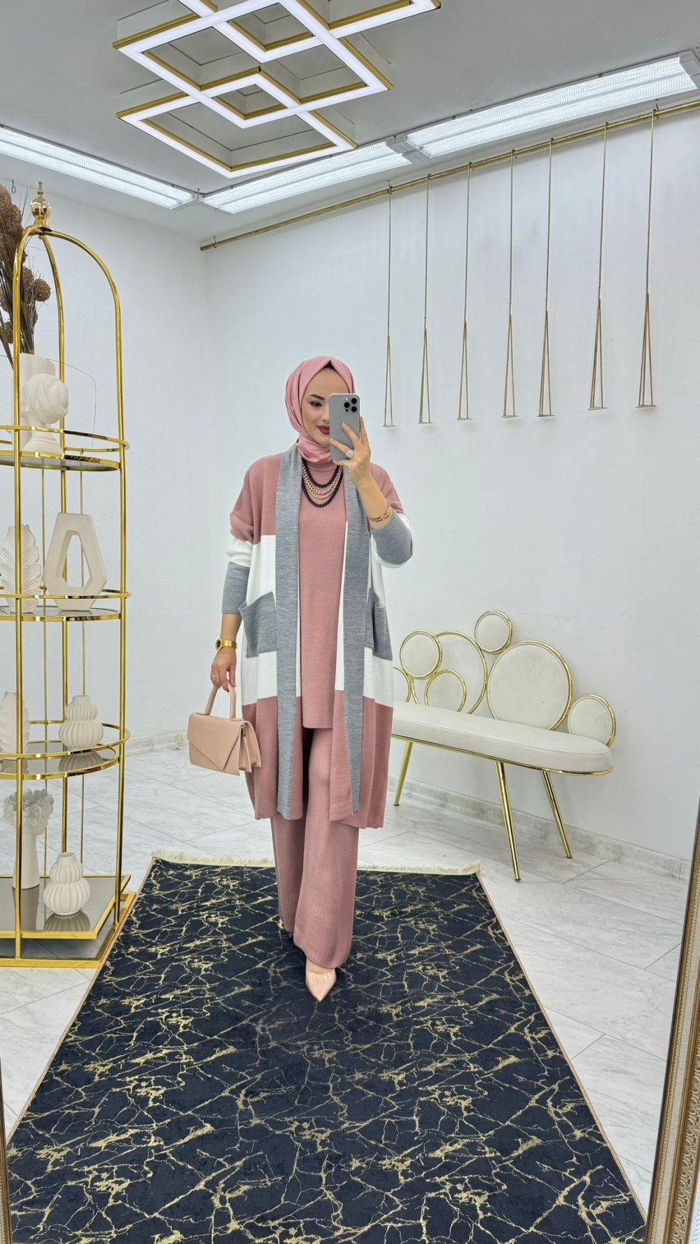 Gül Yeşil Nadide Üçlü Triko Takım Tesettür Giyim