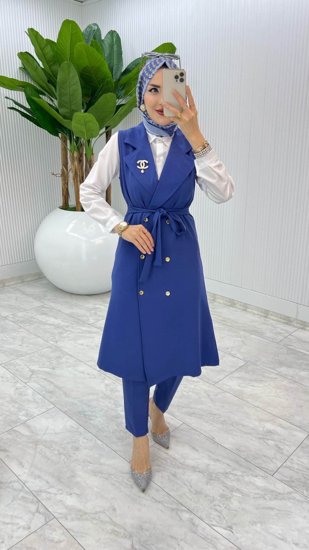 İndigo Broşlu Ala Yelek Takım Tesettür Giyim