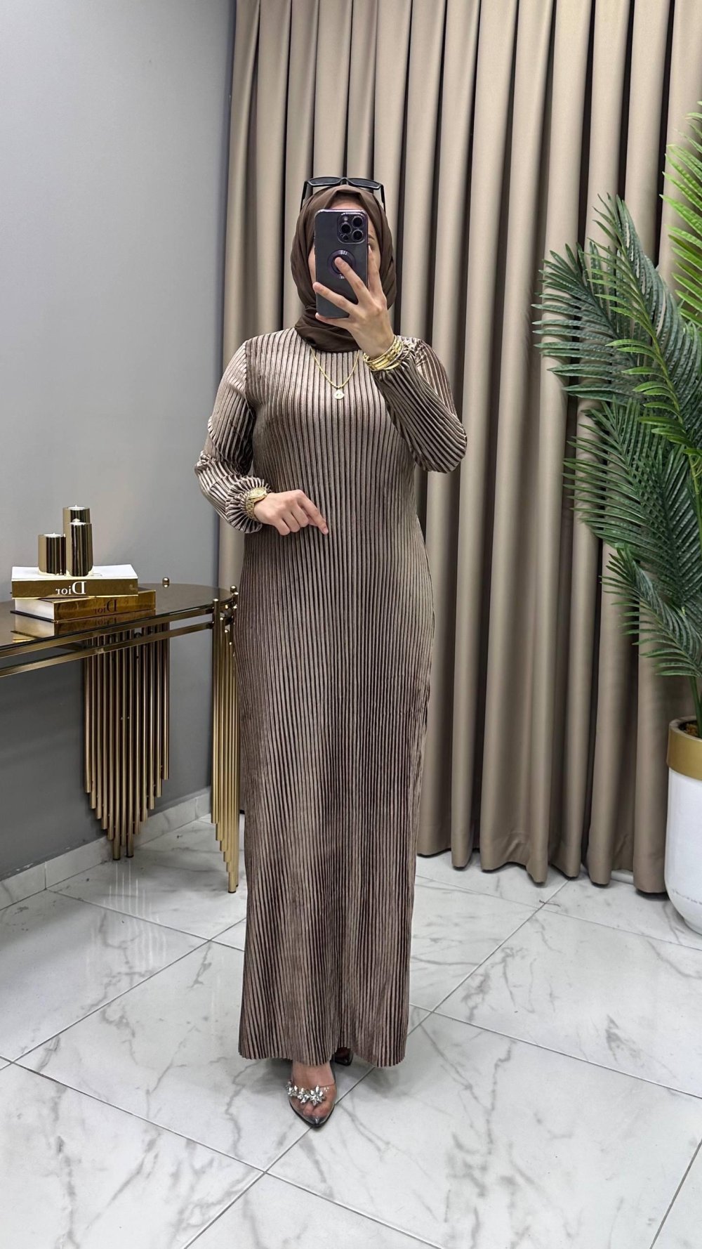 Multi Piliseli Kadife Elbise Kahve Kahverengi