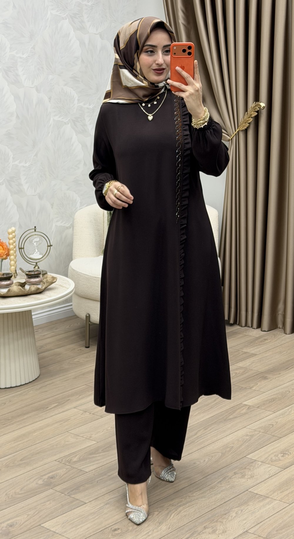 Nevin Takım,hem iş hem de günlük hayatınızda rahatlıkla tercih edebileceğiniz çok yönlü bir parçadır. Şıklığı konforla buluşturan bu tasarım, sezonun en gözde modellerinden biri olacak