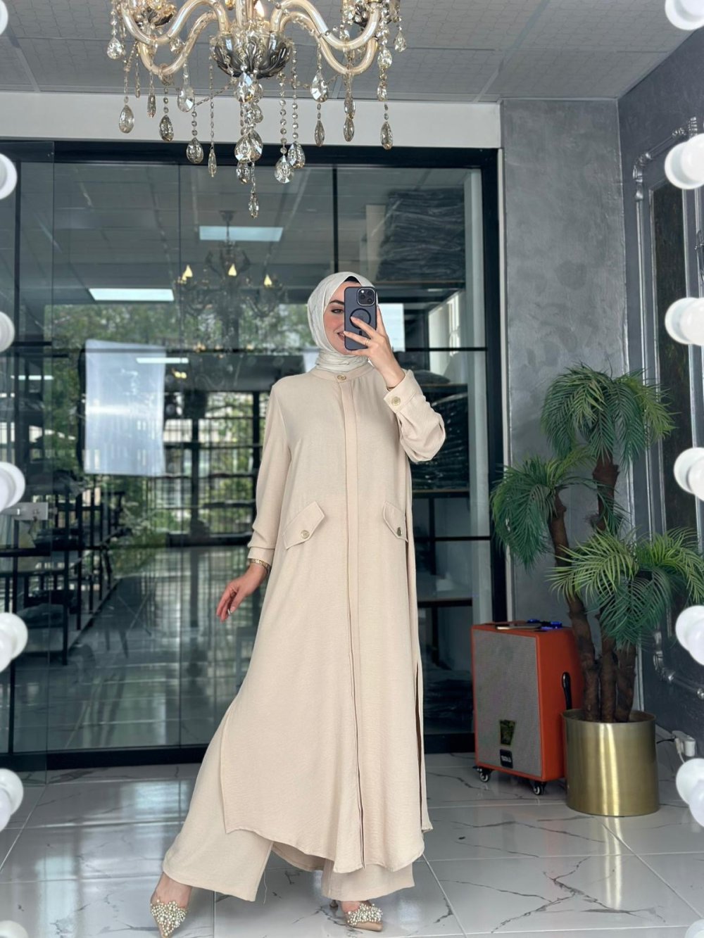 Kumaşı ayrobin kumaştır. Kap Sahte Cep Kapaklı,Kol Ağızı Manşet Düğme,Kap Yan Yırtmaçlı,Pantolon Bel Lastiklidir.