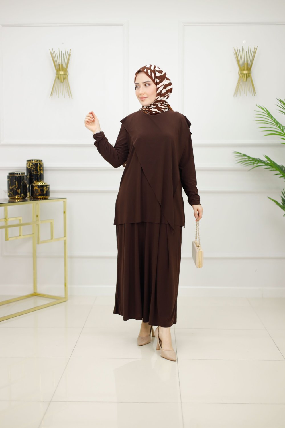 ?Tunik yuvarlak yakalı, ön kısmı asimetrik kesimli kapak detayı mevcuttur.