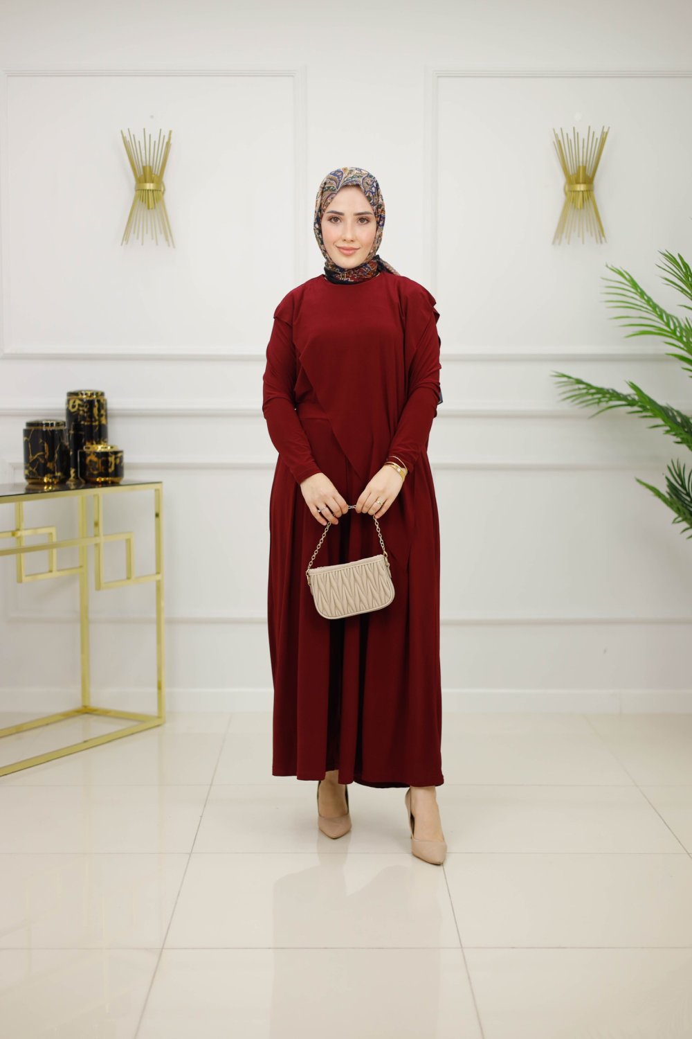 ?Tunik yuvarlak yakalı, ön kısmı asimetrik kesimli kapak detayı mevcuttur.