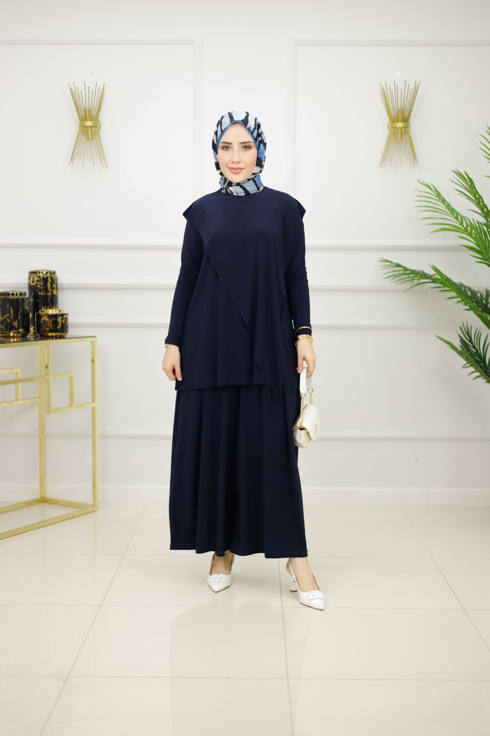 ?Tunik yuvarlak yakalı, ön kısmı asimetrik kesimli kapak detayı mevcuttur.