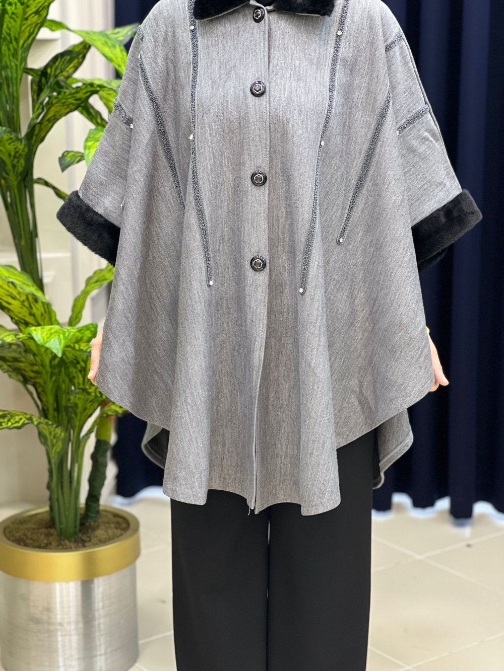 Kürk Detaylı Pançomuz 52 Bedene kadar uyumlu stoklarda Kod Panço: 13131 Taş detaylı ve düğmelidir KUMAŞ :1.Sınıf triko kumaş esnektir BEDEN : 38/52uyumlu standart BOY 90.93cm FİYAT Kargo ücretsiz