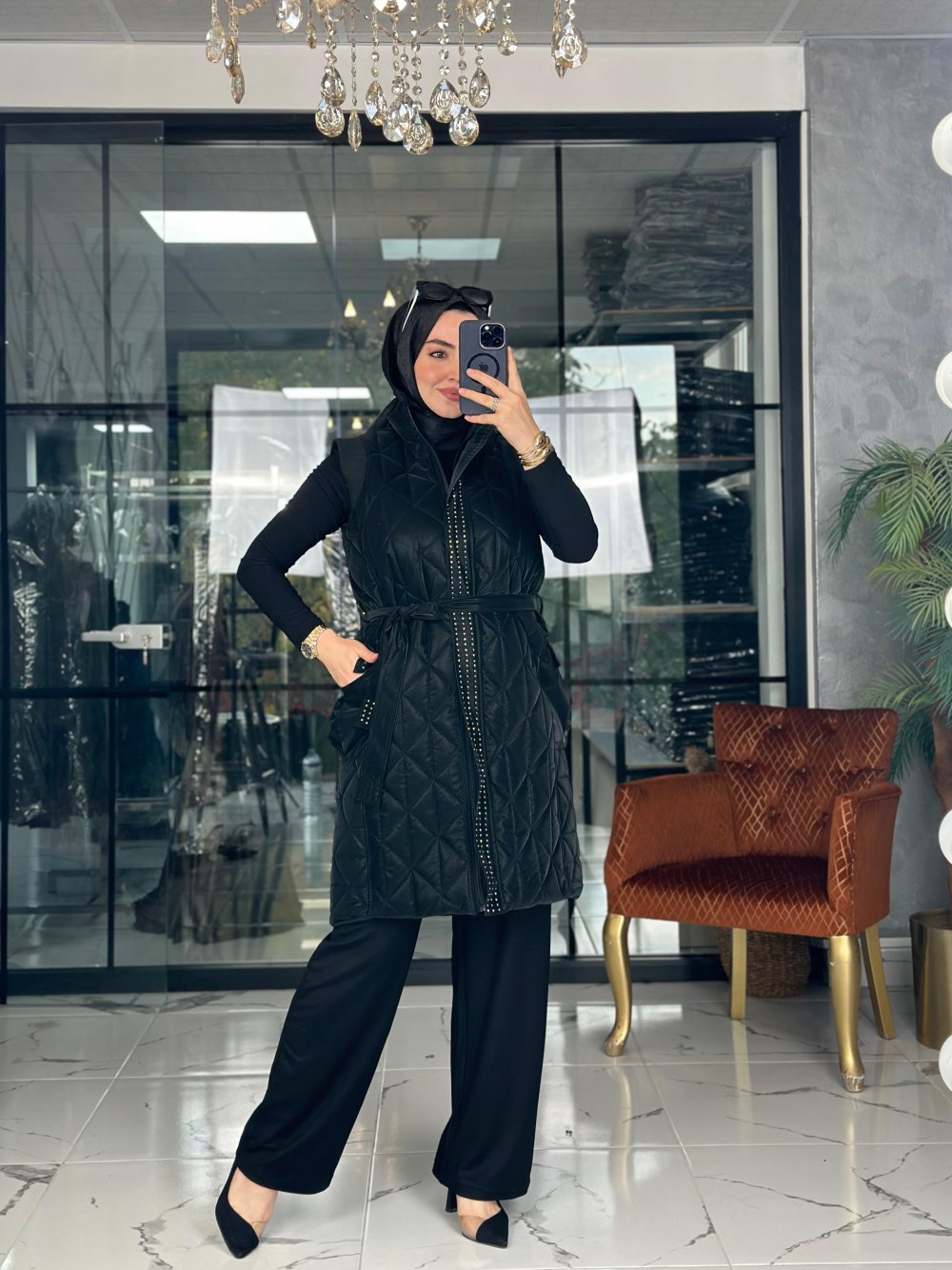 Kumaşı desenli kapitone kumaştır. Önü gizli fermuarlıdır. Seyyar kemeri