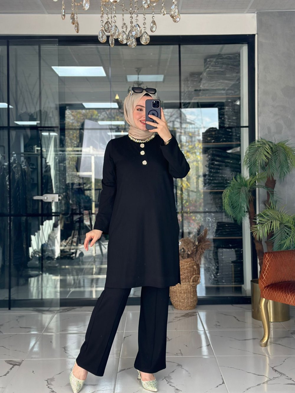 Kumaşı likralı örme kumaştır. Tunik önündeki düğmeler süstür.